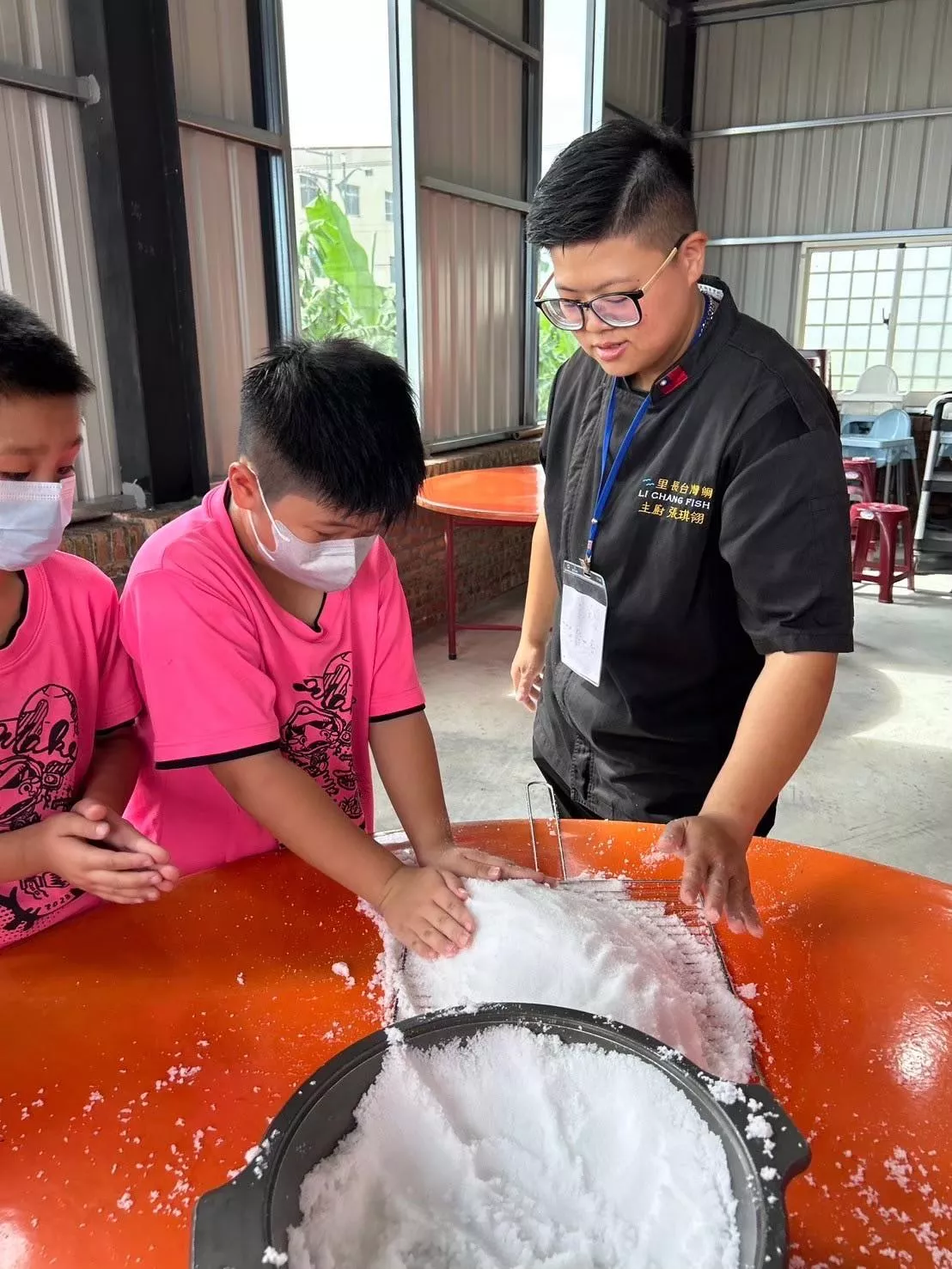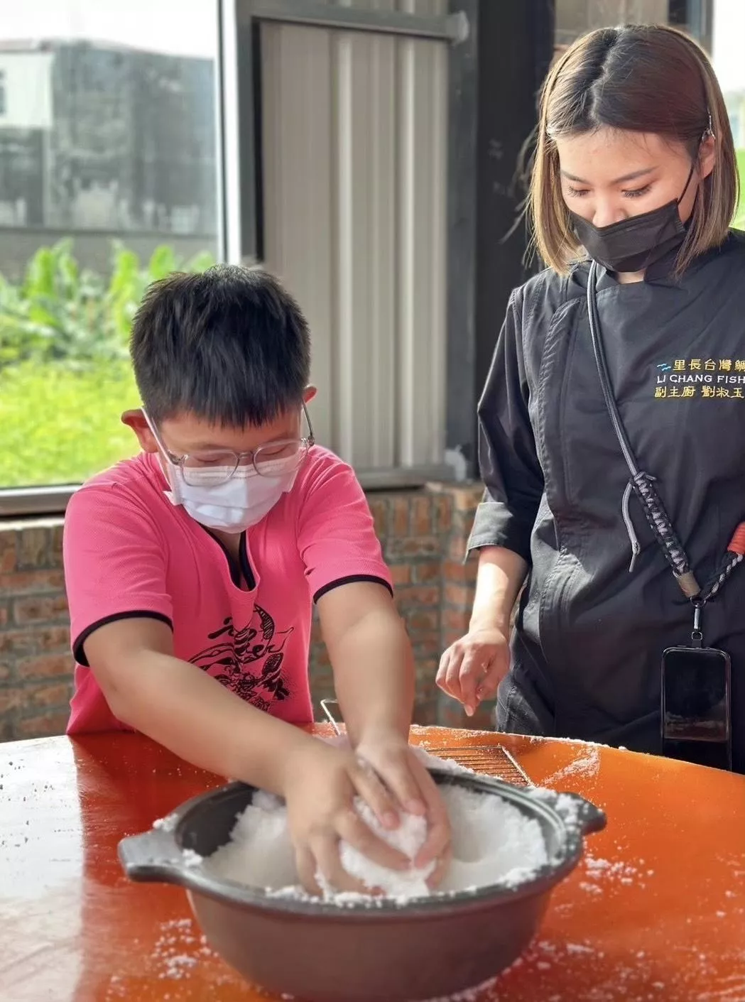 最後體驗製作敲敲魚,學習如何把鹽塗在魚身上,再放入烤箱烘烤,這樣一系列的課程,讓大家了解食魚文化的意義,從產地到餐桌,每一步都值得珍惜。